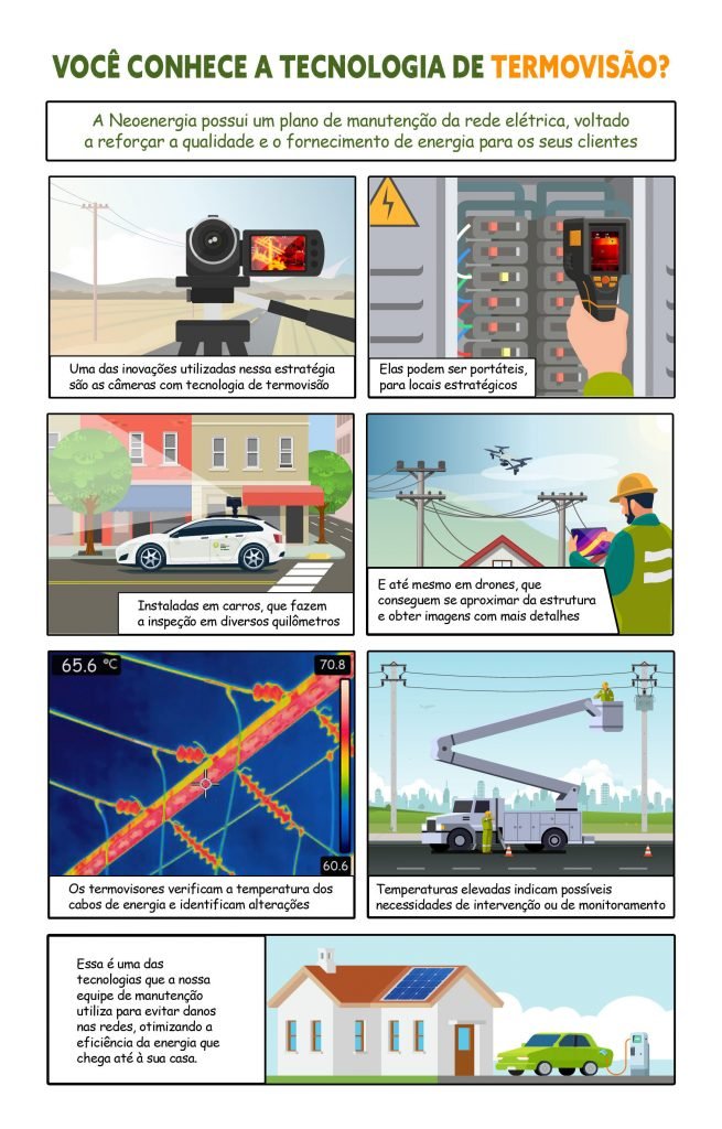 Aproximadamente 48 mil quilômetros. Essa é quantidade percorrida pelos veículos da Neoenergia Coelba equipados com câmeras de termovisão no primeiro semestre deste ano. Utilizado na área operacional da companhia, os termovisores verificam a temperatura dos cabos, conexões e transformadores da rede elétrica, identificando pontos de alteração que podem requerer intervenção ou monitoramento antes que os problemas aconteçam. Além dos veículos equipados com a tecnologia e as câmeras portáteis, a Neoenergia Coelba adquiriu recentemente a drones acoplados aos termovisores, o que permite inspecionar locais de difícil acesso e obter imagens com mais detalhes.