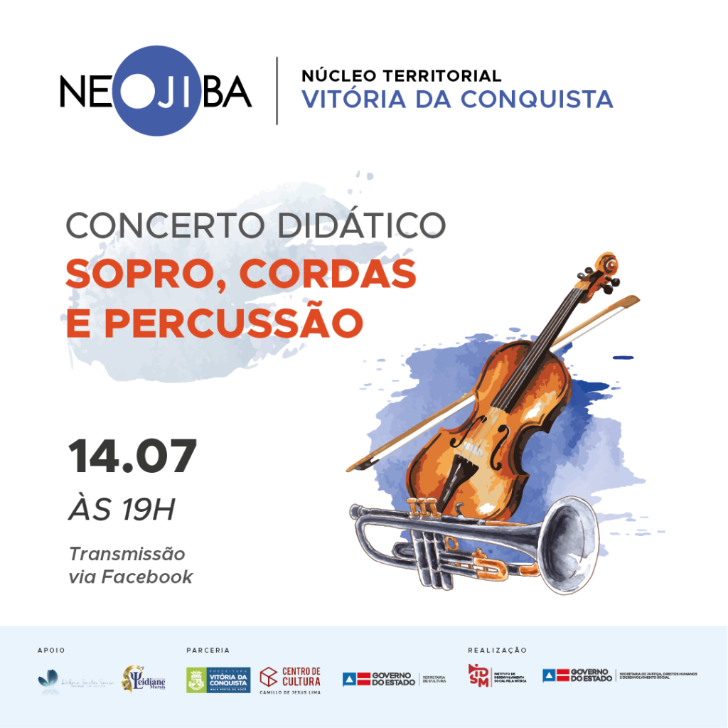 Nesta próxima quarta-feira, 14, às 19 horas, o Núcleo Territorial NEOJIBA (NTN) de Vitória da Conquista realiza um concerto didático de sopro, cordas e percussão. Essa será a segunda apresentação pública deste ano promovida pelo NTN. Assim como o Recital Luiz Gonzaga, que aconteceu em junho, o novo evento será transmitido ao vivo pela página do NEOJIBA no Facebook.