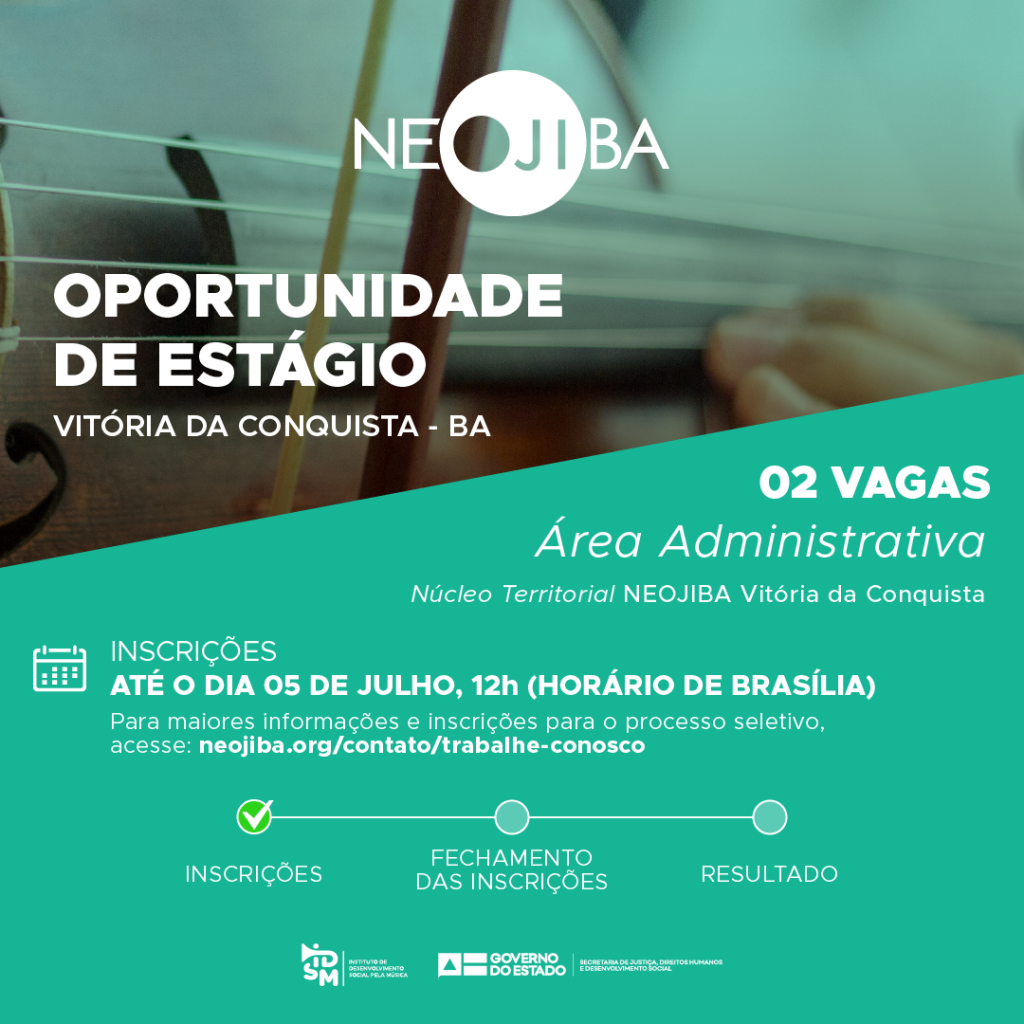 O Instituto de Desenvolvimento Social pela Música (IDSM), Organização Social que faz a gestão do programa NEOJIBA – Núcleos Estaduais Juvenis e Infantis da Bahia, abriu processo seletivo para contratação de dois estagiários para atuar no setor Pedagógico do programa, no NTN de Vitória da Conquista, executando atividades administrativas.