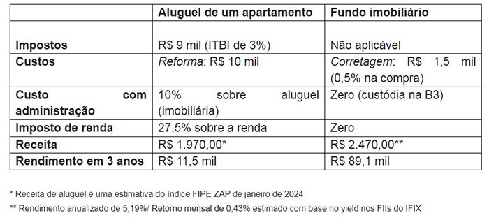 Nesta comparação, os FIIs apresentam vantagens em termos de custos e impostos.