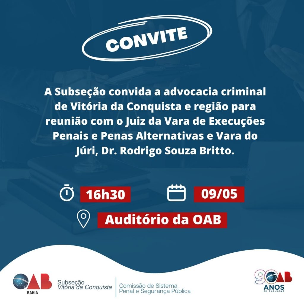 OAB Vitória da Conquista convida para reunião com Dr. Rodrigo Souza Britto novo Juiz da Vara de Execuções Penais 7 de maio de 2022 Destaques, Sudoeste Compartilhe: Clique para imprimir(abre em nova janela) Imprimir Clique para compartilhar no Facebook(abre em nova janela) Facebook Clique para compartilhar no Reddit(abre em nova janela) Reddit Clique para compartilhar no WhatsApp(abre em nova janela) WhatsApp Clique para compartilhar no X(abre em nova janela) 18+ Clique para enviar um link por e-mail para um amigo(abre em nova janela) E-mail Clique para compartilhar no Telegram(abre em nova janela) Telegram Relacionado DestaqueDestaque-HomeDestaques