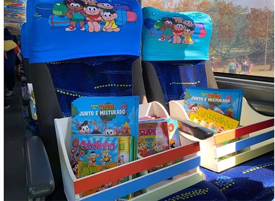 Na realidade o ônibus Temático trata-se de uma grande GiBiblioteca interante, com 42 lugares e diversas atividades para a criançada, com estampas dos personagens infantis.