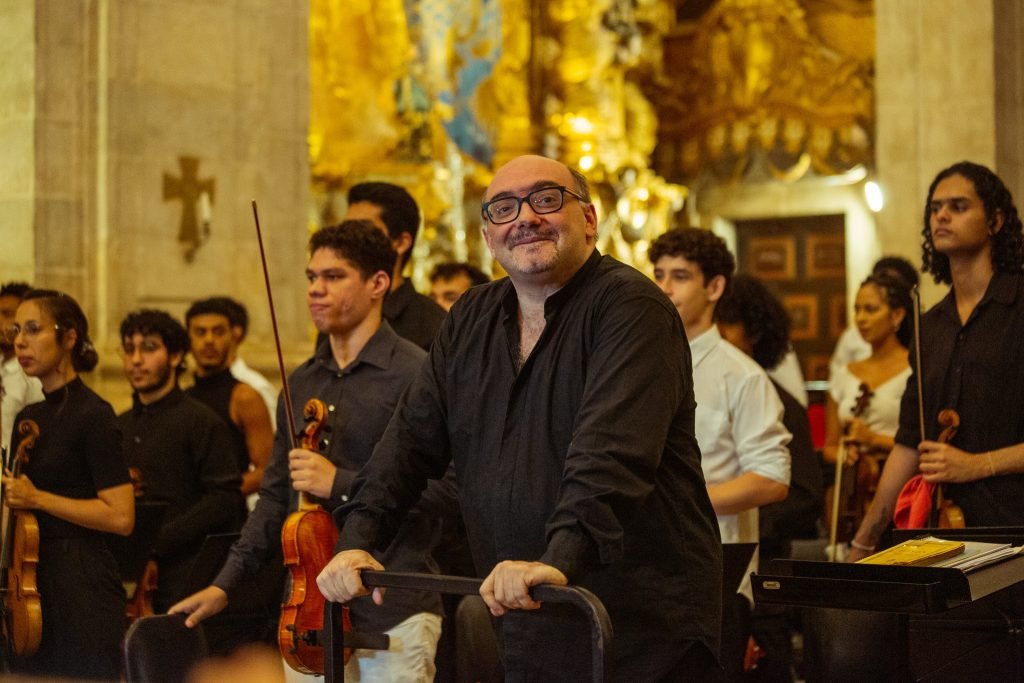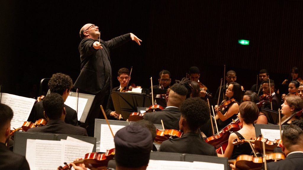 O maestro italiano Edoardo Rosadini colabora com o NEOJIBA desde 2020, ministrando aulas e comandando apresentações. “É sempre muito lindo ver o desenvolvimento dos jovens, o cuidado com cada detalhe, e ver como crescem juntos. É uma experiência magnífica”, conta. Na Itália, Rosadini é o diretor-professor da Orquestra da Escola de Música de Fiesole, composta por 80 crianças e adolescentes entre oito e 17 anos.