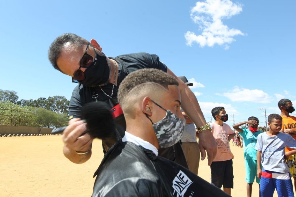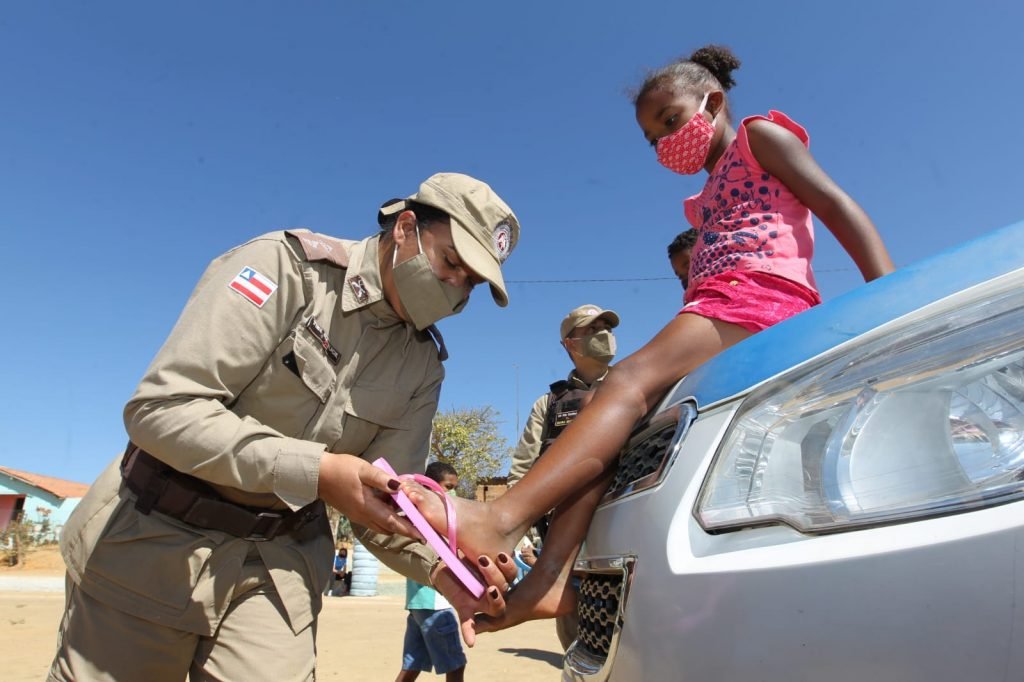 Nos bairros periféricos da cidade, a Patrulha Solidária distribuiu, ainda, cestas básicas, cobertores dorme bem, mantas produzidas pela própria corporação, e para as crianças chinelos e máscaras novas, e ainda corte de cabelo, fruto de parceria com barbearia da cidade.]