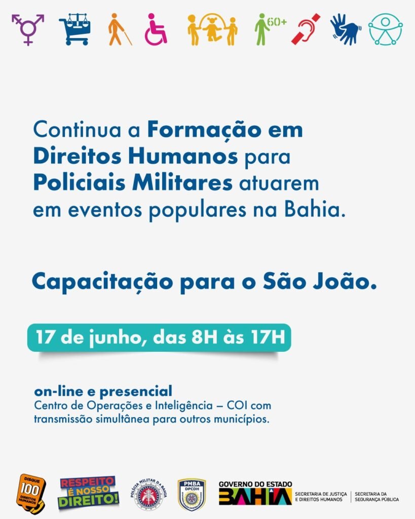 Com foco nas ações preventivas do Plantão Integrado dos Direitos Humanos nas festas juninas, a Secretaria de Justiça e Direitos e Direitos Humanos – SJDH e a Polícia Militar da Bahia, através do Departamento de Polícia Comunitária e Direitos Humanos (DPCDH), promovem, na próxima segunda-feira (17), a “Formação das Forças de Segurança”.