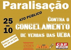 As ameaças do Governo Wagner sobre as Universidades Estaduais da Bahia (Ueba) continuam com o prenúncio de um novo Projeto de Lei com o objetivo de congelar o escasso orçamento das instituições de ensino superior. Diante disso, os professores da Universidade Estadual do Sudoeste da Bahia (Uesb), em conjunto com as demais Universidades e segmentos da comunidade acadêmica iniciam nesta terça, 25, com uma paralisação geral, uma forte mobilização para barrar a iniciativa.