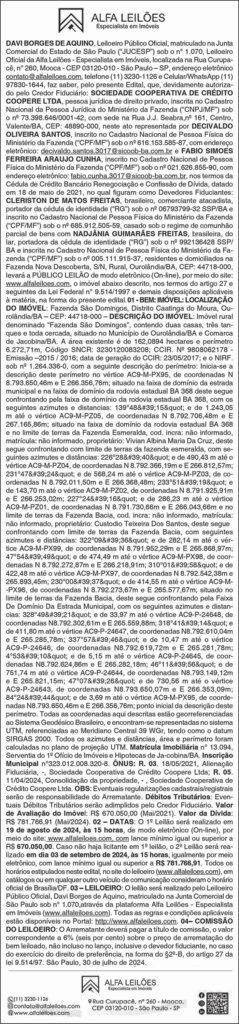 Resumo do edital de leilão da Fazenda São Domingos em Ourolândia-BA publicado na versão impressa desta terça-feira, 07/08 7 de agosto de 2024 Bahia, Destaques, SudoesteCompartilhe: Clique para imprimir(abre em nova janela) Imprimir Clique para compartilhar no Facebook(abre em nova janela) Facebook Clique para compartilhar no Reddit(abre em nova janela) Reddit Clique para compartilhar no WhatsApp(abre em nova janela) WhatsApp Clique para compartilhar no X(abre em nova janela) 18+ Clique para enviar um link por e-mail para um amigo(abre em nova janela) E-mail Clique para compartilhar no Telegram(abre em nova janela) Telegram Relacionado DestaqueDestaque-HomeDestaques