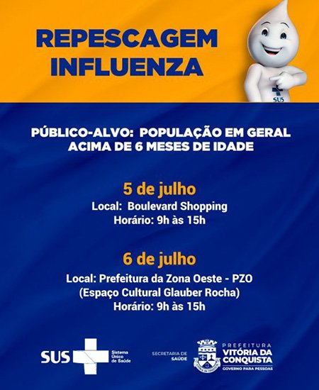 A Secretaria Municipal de Saúde (SMS) realiza nesta quarta (5) e quinta-feira (6), uma ação de vacinação contra a influenza para pessoas acima dos seis meses de idade, que ainda não foram imunizadas.