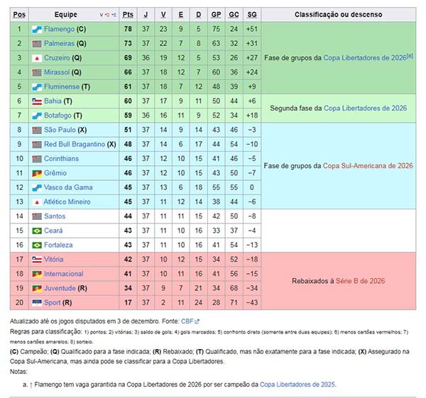 Na penúltima rodada, 37ª, e depois desses dois resultados, o Flamengo é o campeão e o Palmeiras o vice do Campeonato Brasileiro, serie A masculino 2025.