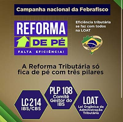 A Federação Brasileira dos Sindicatos das Carreiras da Administração Tributária (Febrafisco) lançou a campanha “Reforma de Pé: eficiência se faz com todos na LOAT”, um movimento nacional em defesa de uma Administração Tributária forte, autônoma e democrática.