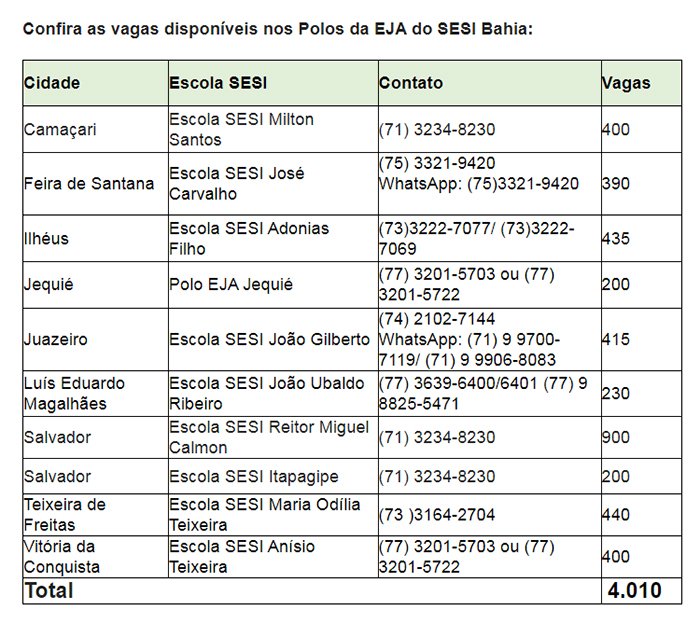 As vagas são oferecidas nos polos da Educação de Jovens e Adultos do SESI Bahia, nas cidades de Camaçari (400), Feira de Santana (390), Ilhéus (435), Jequié (200), Juazeiro (415), Luís Eduardo Magalhães (230), Salvador (1.100), Teixeira de Freitas (440), Vitória da Conquista (400).