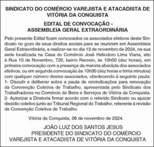 Sindicomércio publica edital de convocação de Assembleia Geral Extraordinária