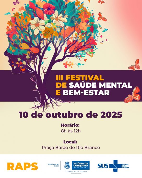 Na próxima sexta-feira (10), a Prefeitura, por meio da Rede de Atenção Psicossocial de Vitória da Conquista (Raps), realiza o III Festival de Saúde Mental e Bem-Estar.