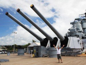 Outro lugar que vale a pena ser visitado em Pearl Harbor é o navio USS Missouri. Lançado no inicio de 1944, este gigante dos mares lutou bravamente na Segunda Guerra Mundial, na guerra da Coréia e na guerra do Golfo. Com quase 300 metros de comprimento, o Missouri está em perfeitas condições e mantém a bordo seus canhões e lançadores de mísseis, que, nesta foto, Peter Goldschmidt aparece de braços abertos, mostrando a grandeza das máquinas.