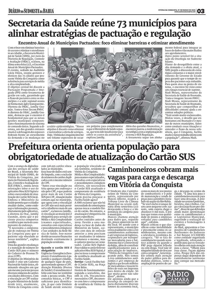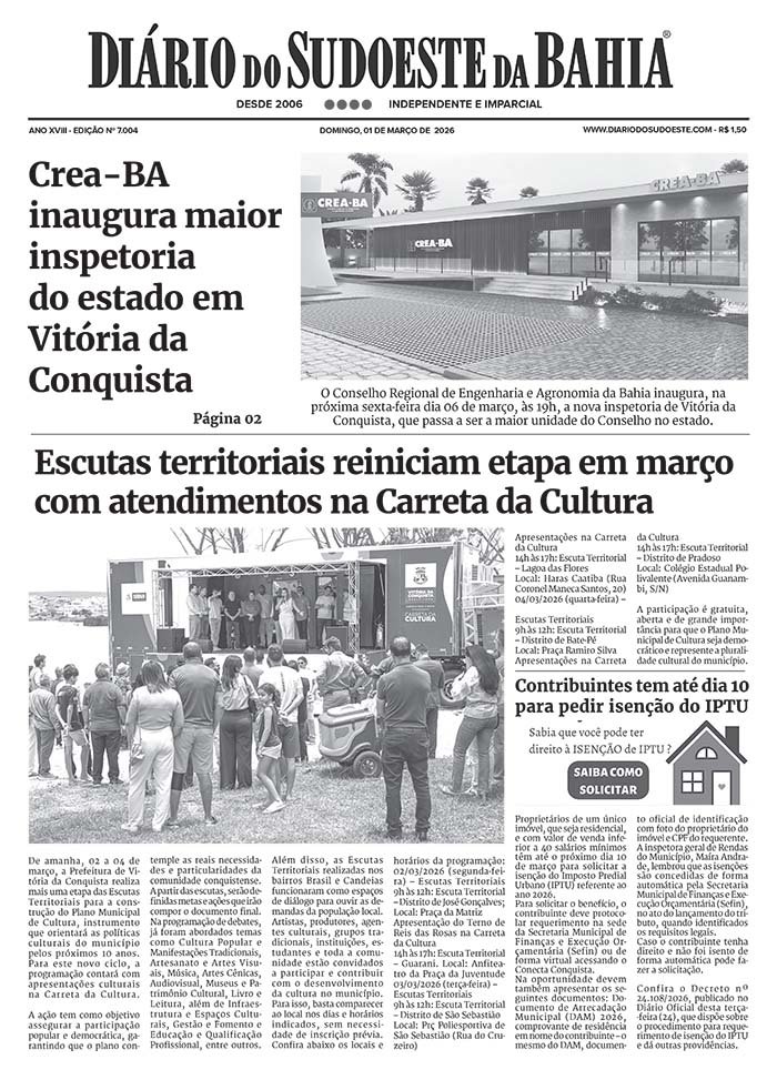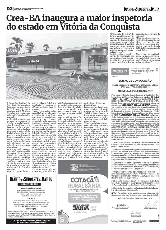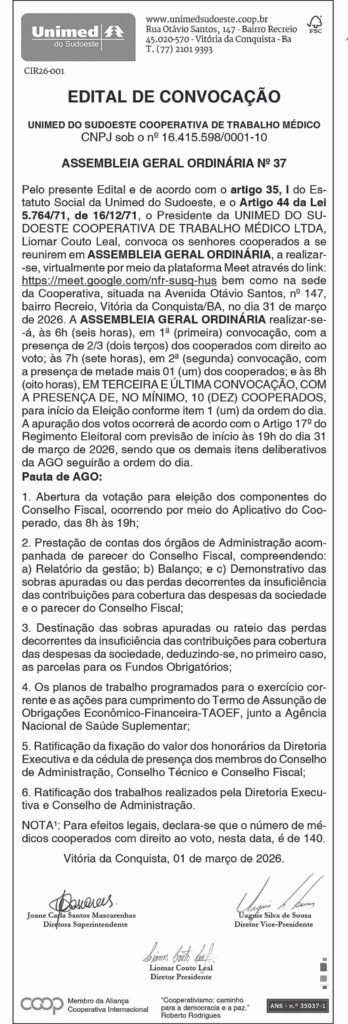 Unimed do Sudoeste convoca cooperados para Assembleia Geral Ordinária 28 de fevereiro de 2026 Destaques, SudoesteEdital de Convocação dos Cooperados para Assembleia Geral Ordinária da Unimed do Sudoeste, publicado na versão impressa do dia 01 de março de 2026, página 02.Compartilhe: Imprimir(abre em nova janela) Imprimir Compartilhar no Facebook(abre em nova janela) Facebook Compartilhar no Reddit(abre em nova janela) Reddit Compartilhar no WhatsApp(abre em nova janela) WhatsApp Compartilhar no X(abre em nova janela) 18+ Envie um link por e-mail para um amigo(abre em nova janela) E-mail Compartilhar no Telegram(abre em nova janela) Telegram Relacionado Assembleia Geral OrdináriabahiaConvocaçãoCooperadosDestaqueDestaque-HomeDestaquesEditalMédicosOportunidadesUnimed do Sudoeste