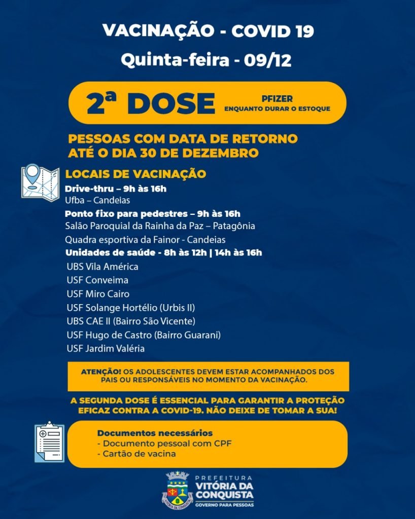 O adiantamento da 2ª dose da Pfizer foi ampliado para as pessoas que têm data de retorno até o dia 30 de dezembro. A vacinação será de 9h às 16h no drive-thru na Ufba (Candeias), nos pontos fixos do Salão Paroquial da Rainha da Paz (Patagônia) e quadra esportiva da Fainor (Candeias), além das unidades de saúde no horário de 8h às 12h e de 14h às 16h.