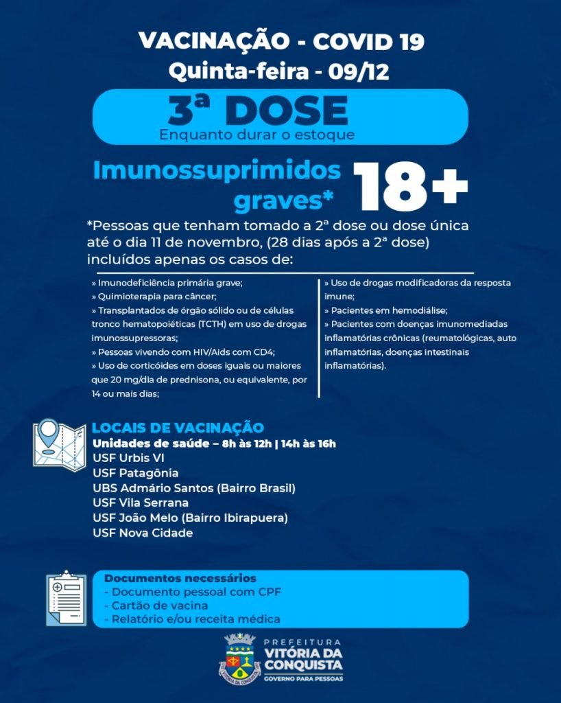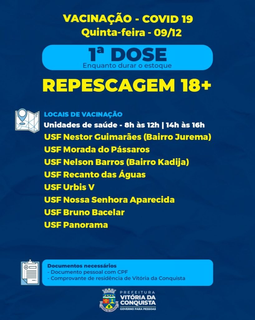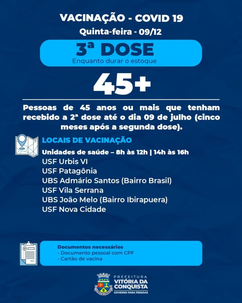 O município prossegue com a vacinação nesta quinta-feira (9) para repescagem com a 1ª dose nas unidades de saúde para as pessoas maiores de 18 anos que ainda não se vacinaram, além das vacinações com 2ª e 3ª doses.