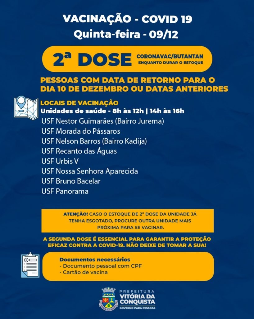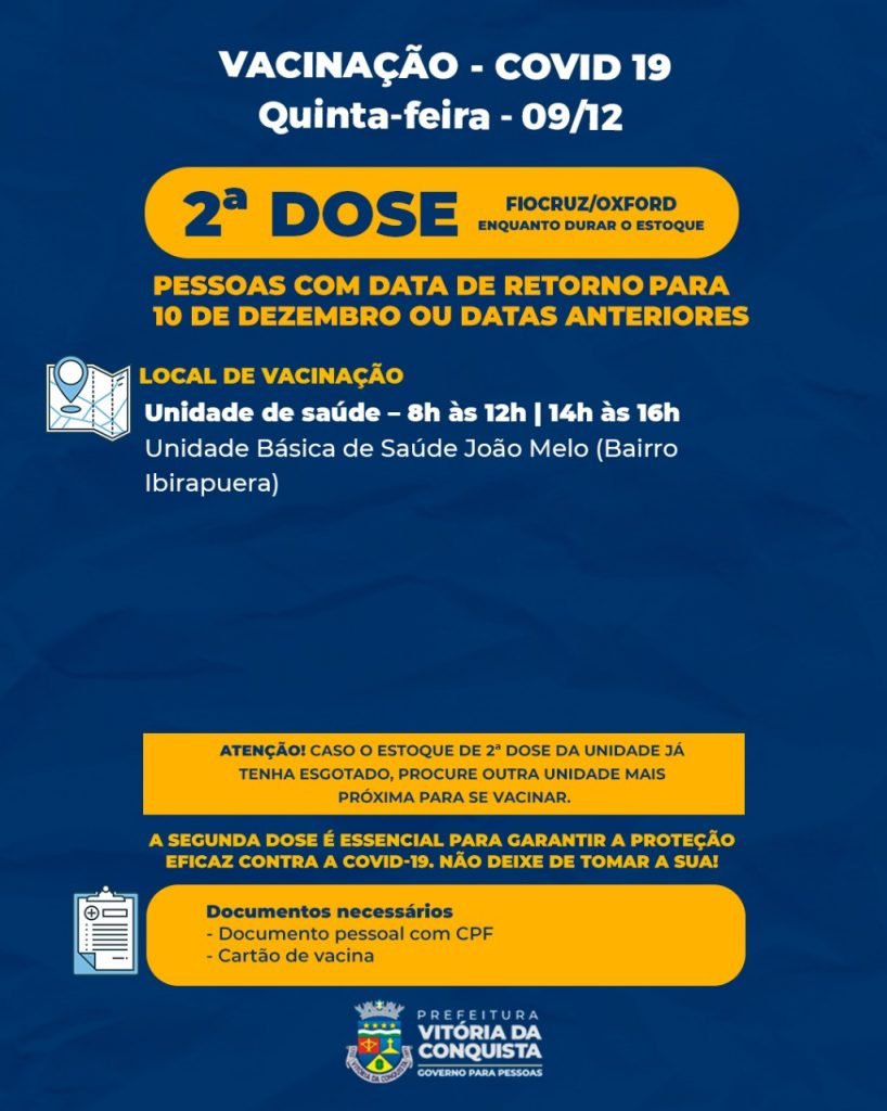 A 2ª dose da Fiocruz/Oxford está disponível apenas na Unidade Básica de Saúde João Melo, no bairro Ibirapuera, para as pessoas que têm data de retorno até o dia 10 de dezembro ou que estão em atraso.