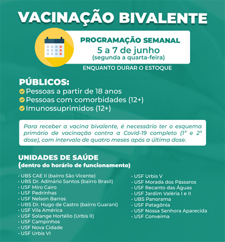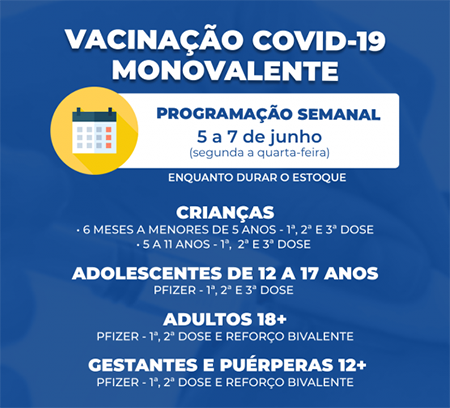Nesta semana, a vacinação contra a Covid-19, bivalente e monovalente, nas unidades de saúde ocorrerá somente de segunda (5) a quarta-feira (7), devido ao feriado de Corpus Christi na quinta-feira (8) e ao ponto facultativo na sexta (9), conforme o decreto n° 22.657.
