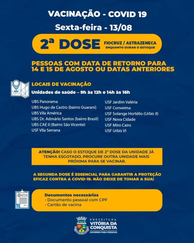 A vacinação será das 9h às 12h e das 14h às 16h, nas 12 unidades que estão aplicando a 2ª dose, são elas: UBS Panorama, UBS Hugo de Castro (bairro Guarani), UBS Vila América, UBS Dr. Admário Santos (bairro Brasil), UBS CAE II (Bairro São Vicente), USF Vila Serrana, USF Jardim Valéria, USF Conveima, USF Solange Hortélio (Urbis II), USF Nova Cidade, USF Miro Cairo e USF Urbis VI.