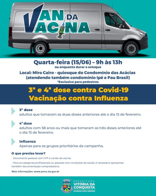 Nesta quarta-feira (15), a Van da Vacina estará no bairro Miro Cairo, estacionada em frente ao quiosque do Condomínio das Acácias, de 9h às 13h, ofertando a 3ª e 4ª dose contra a Covid-19, e a vacina contra a Influenza para os grupos prioritários da campanha. A ação inclui também as áreas dos condomínios Ipê e Pau Brasil.