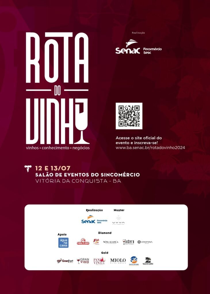 O Senac Bahia convida você para a 2ª edição da Rota do Vinho em Vitória da Conquista, nos dias 12 e 13 de julho. Será um evento de vinhos, com degustações e uma feira especial.