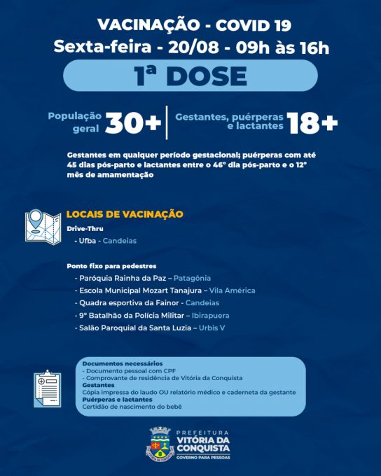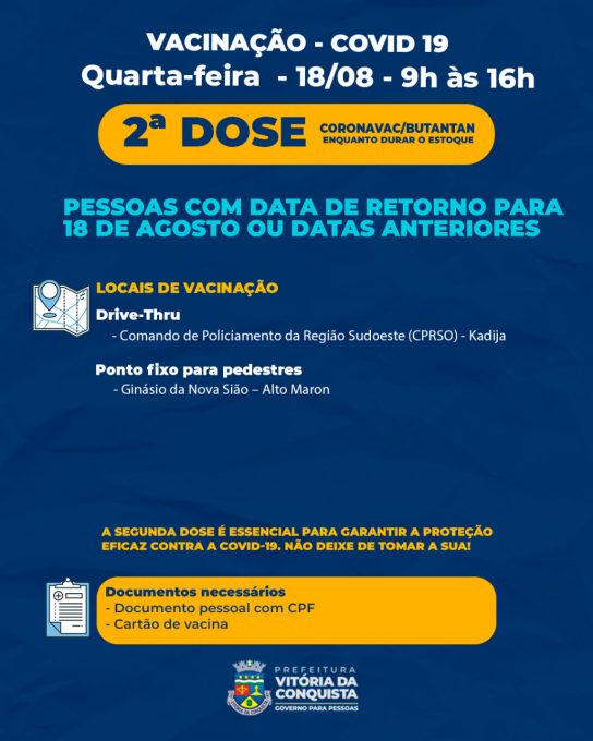 A vacinação com a 2ª dose da Coronavac/Butantan será de 9h às 16h, no drive-thru do Comando de Policiamento da Região Sudoeste (CPRSO), no bairro Kadija, e o no ponto fixo para pedestres do Ginásio da Nova Sião, no Alto Maron.
