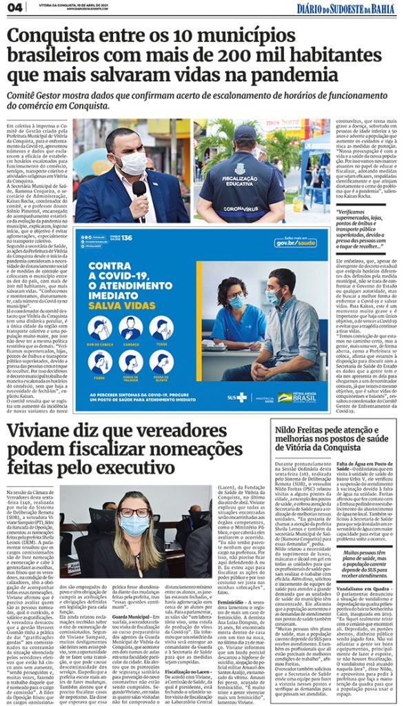 Segundo a secretária de Saúde, as ações da Prefeitura de Vitória da Conquista desde o início da pandemia consideram a necessidade do distanciamento social e de medidas de controle que colocaram o município entre os dez do país, com mais de 200 mil habitantes, que mais salvaram vidas. “Conhecemos e monitoramos, diuturnamente, cada número da Covid-19 no município. Entendemos que o governo estadual também se preocupa com o mesmo que nós, que é salvar vidas, mas temos a condição de estar mais perto do problema e assim podemos avaliar melhor, com parâmetros científicos, qual medida o município poderá tomar frente ao cenário de pandemia”, afirmou Ramona.