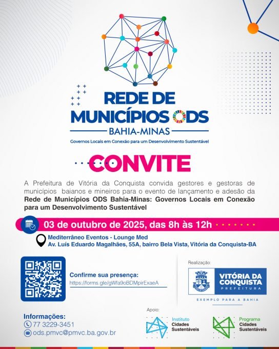 A Prefeitura de Vitória da Conquista realiza nesta sexta-feira (3), o lançamento e adesão da Rede de Municípios ODS Bahia-Minas Gerais: Governos locais em conexão para um desenvolvimento sustentável, com a participação exclusiva de gestores municipais dos dois estados.