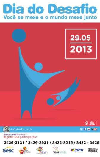 No dia 29 de Maio (QUARTA-FEIRA), participe do Dia do Desafio 2013, tire pelo menos 15 minutos do seu dia para praticar alguma atividade física: vale caminhar, correr, pedalar, nadar, alongar, fazer musculação, jogar ou realizar qualquer outra atividade física e ligue para 3426-3131, 3426-2931, 3422-8215, 3422-3929